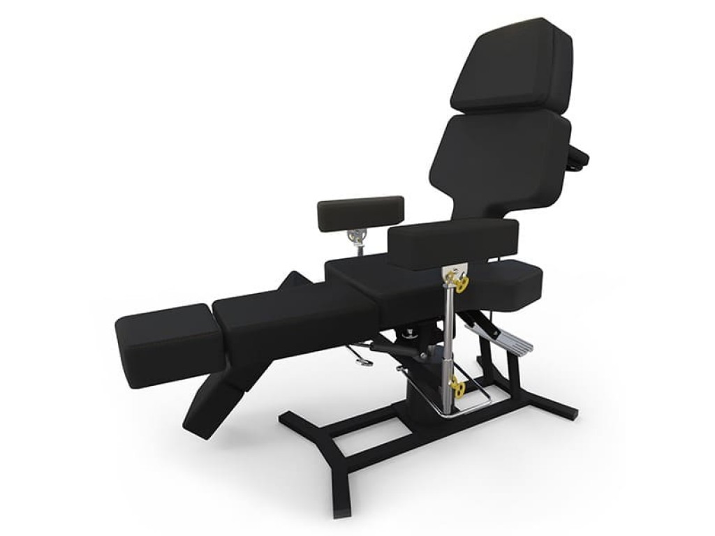 com regulagem mecânica e reclinação máxima de 180º. Braços com regulagem 360º, de altura e removíveis.